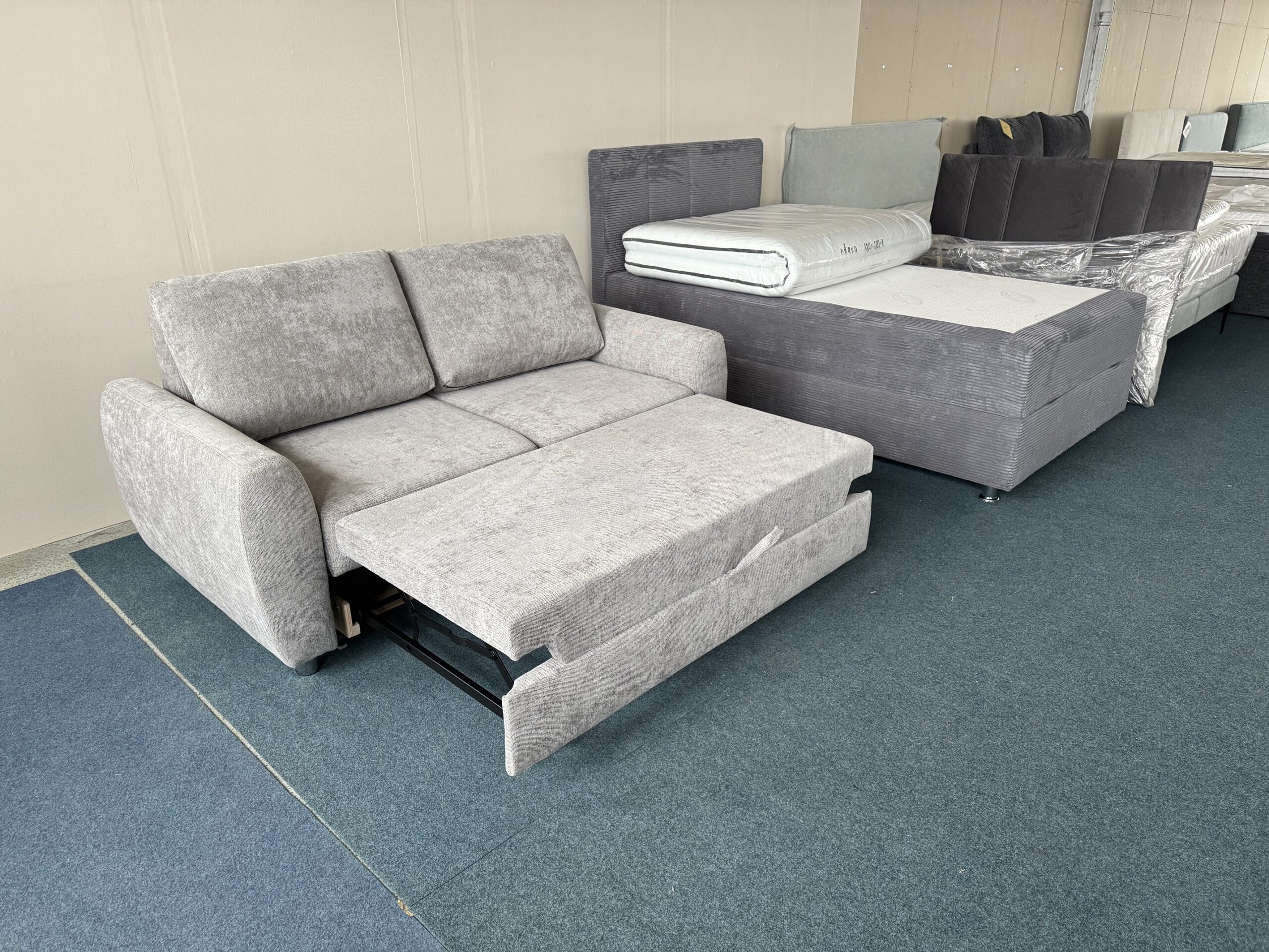 Dīvāns-izvelkams,ar veļas kasti+spilveni. Var izvilkt divos veidos. Izvelkamai daļai apakšā ir reliņi. Finiera rāmis.