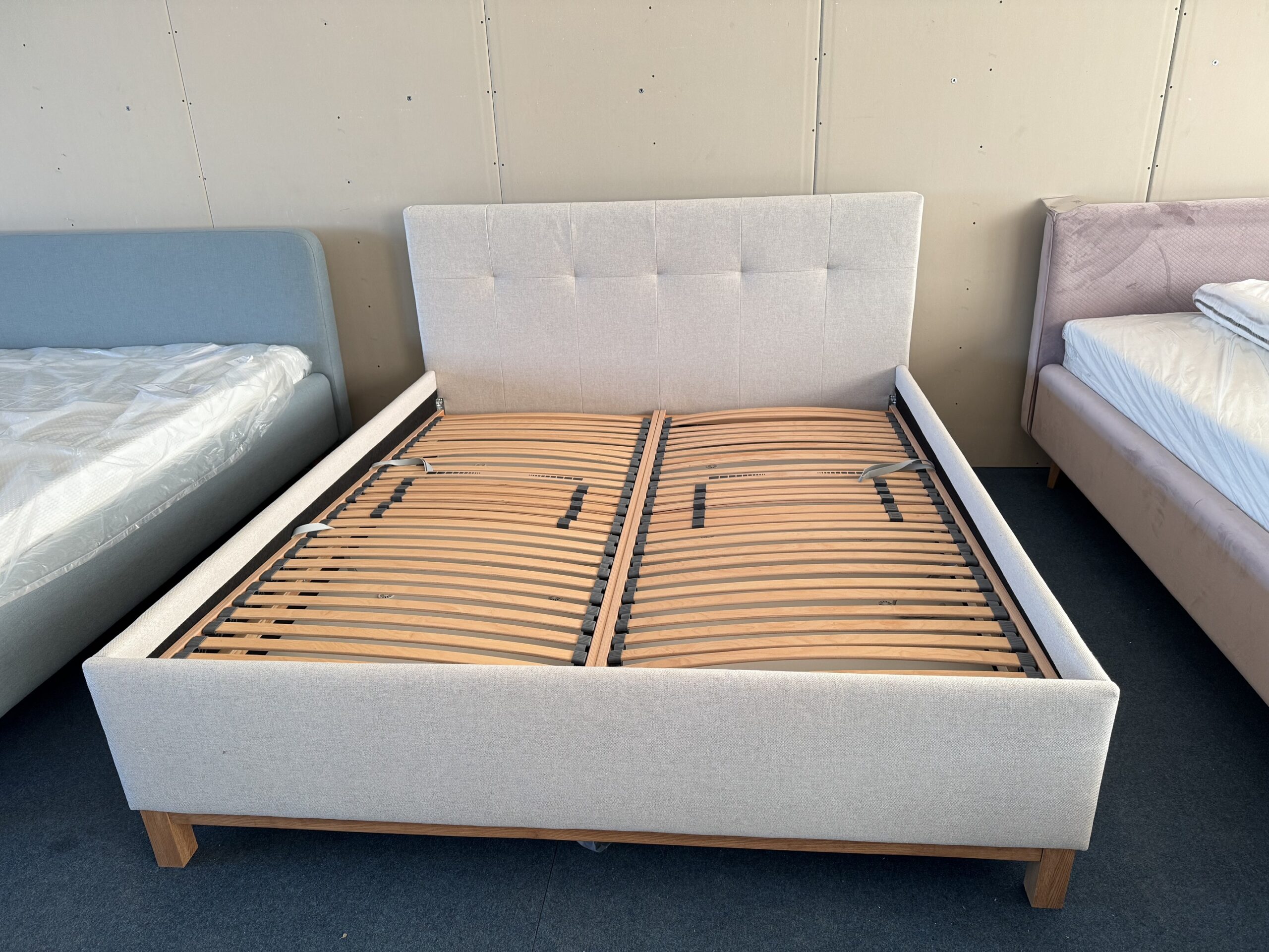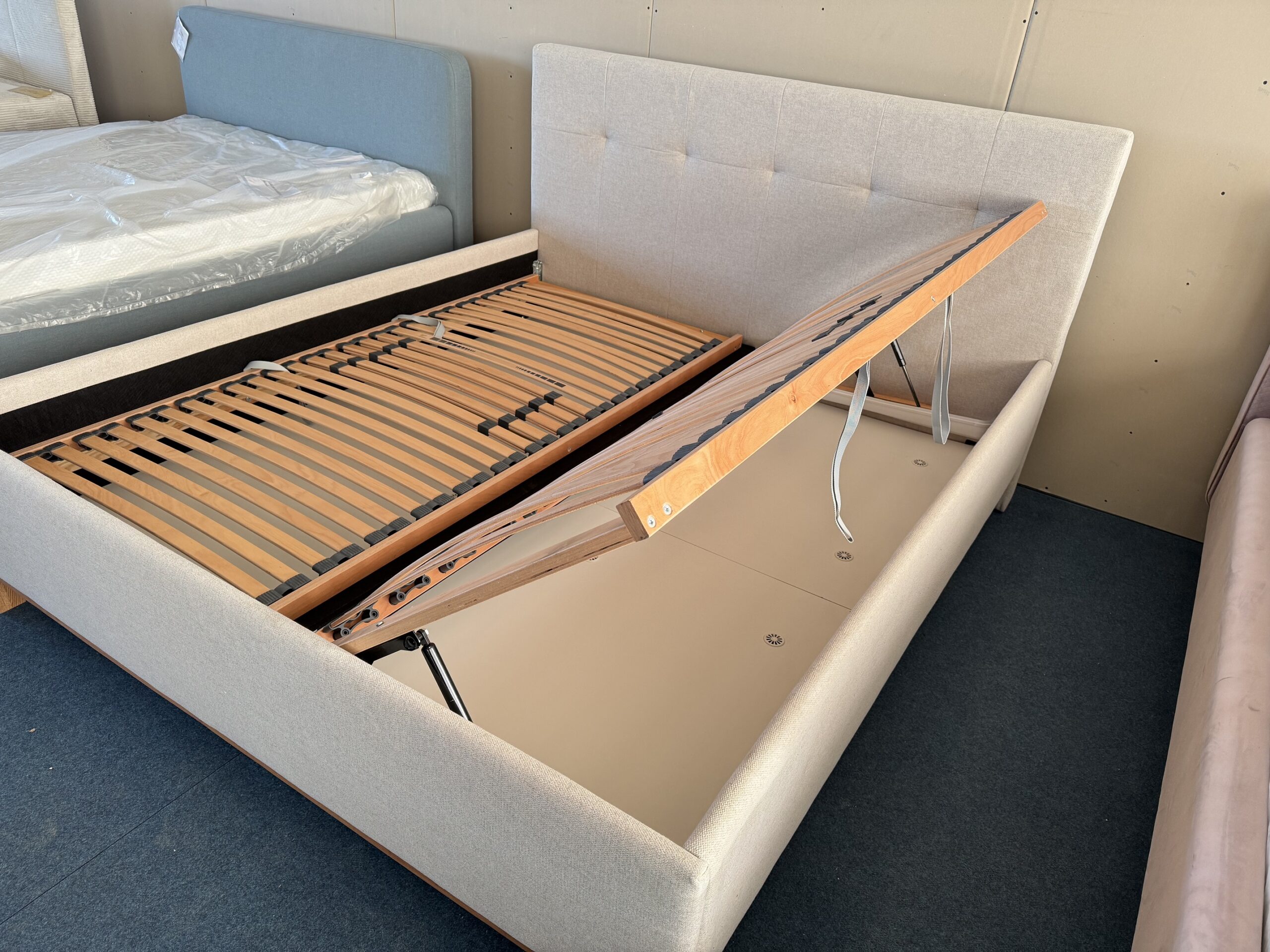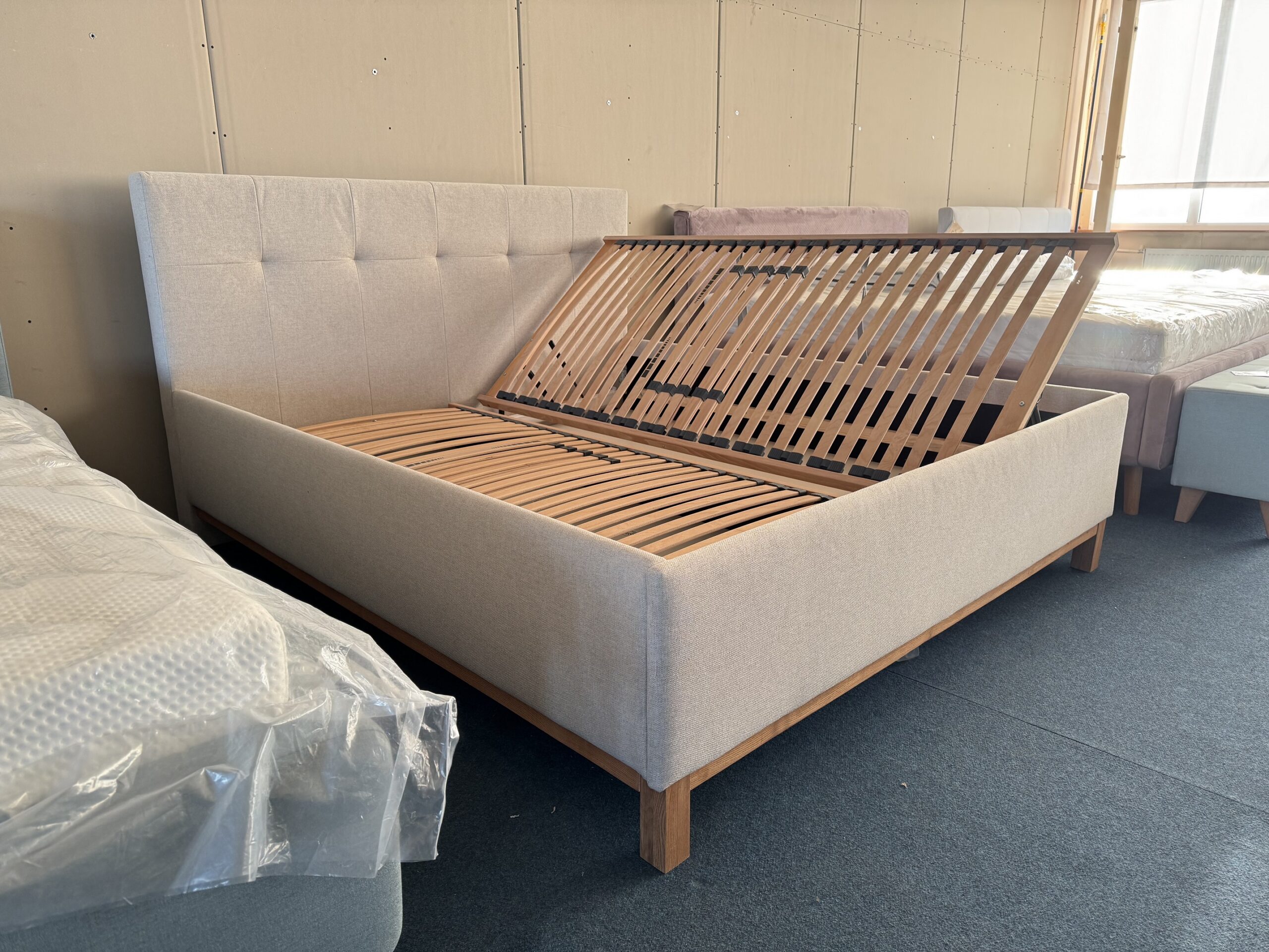 Gulta-auduma, ar reliņiem un veļas kastēm.Dabīgā koka rāmisin kājas. Kvalitatīvs, biezs audums.