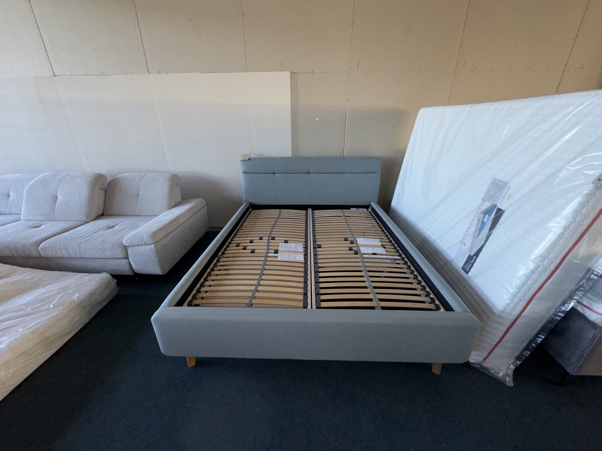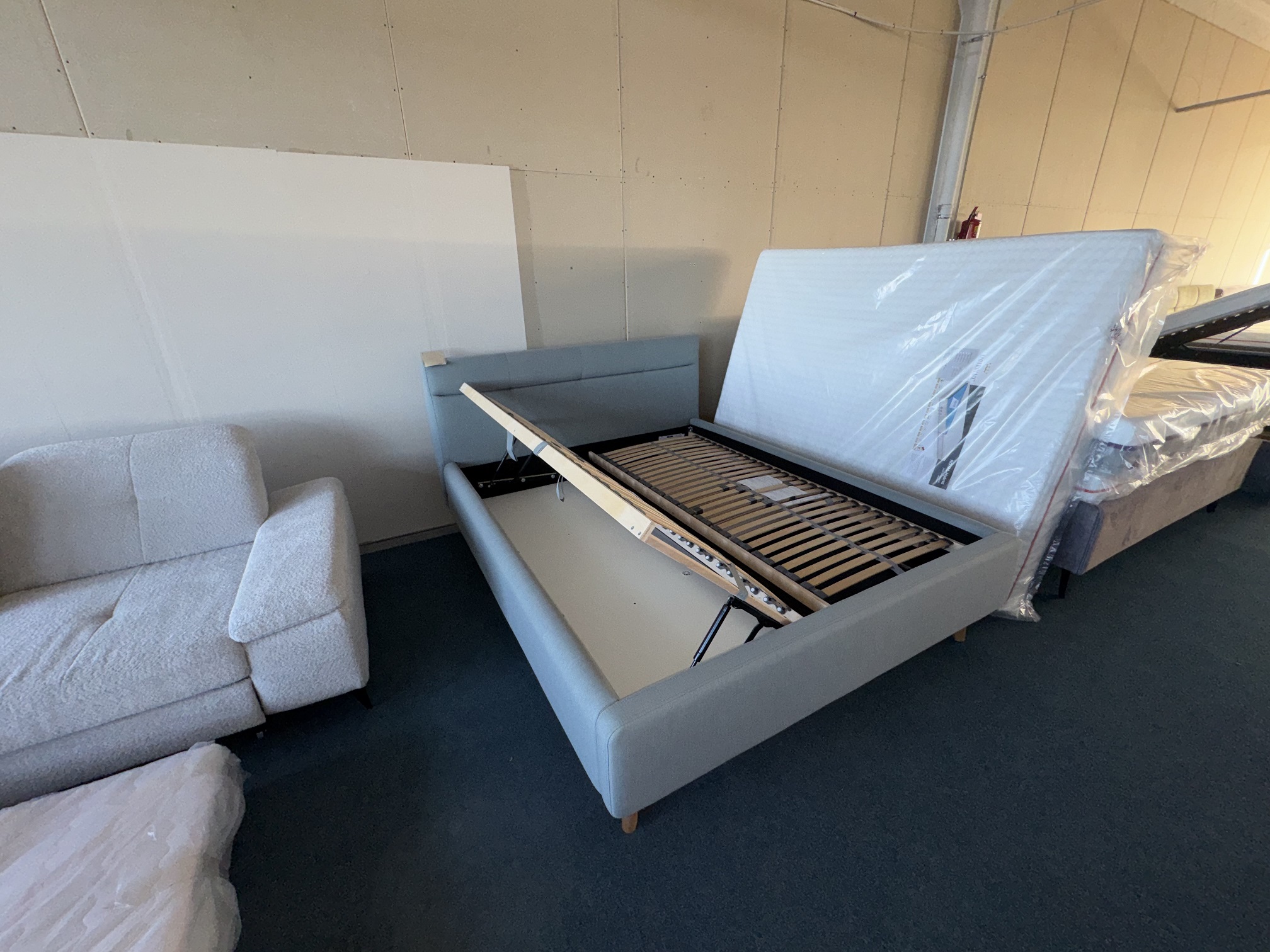 Gulta-auduma, ar reliņiem un veļas kastēm. Ir pieejami matrači.