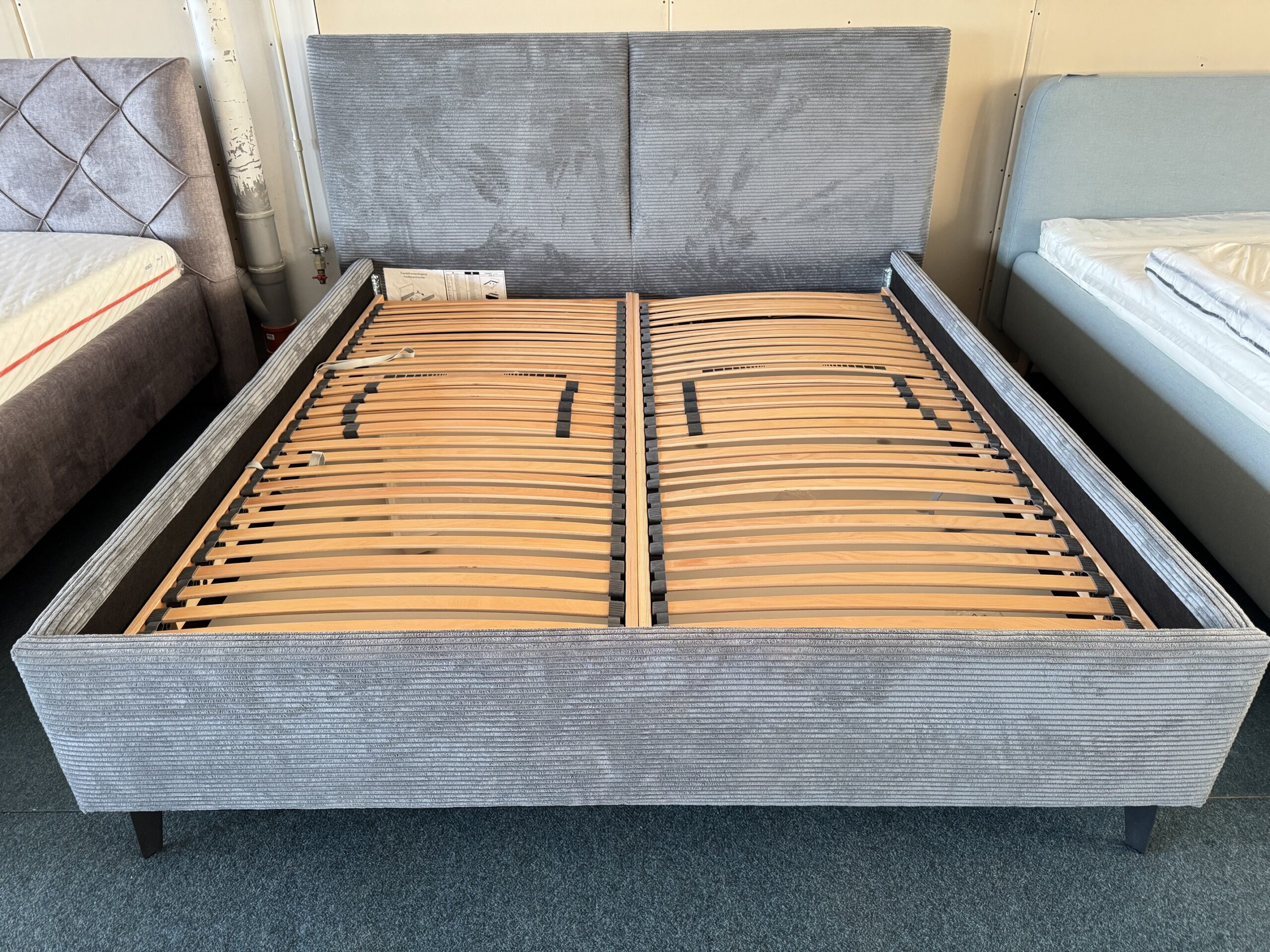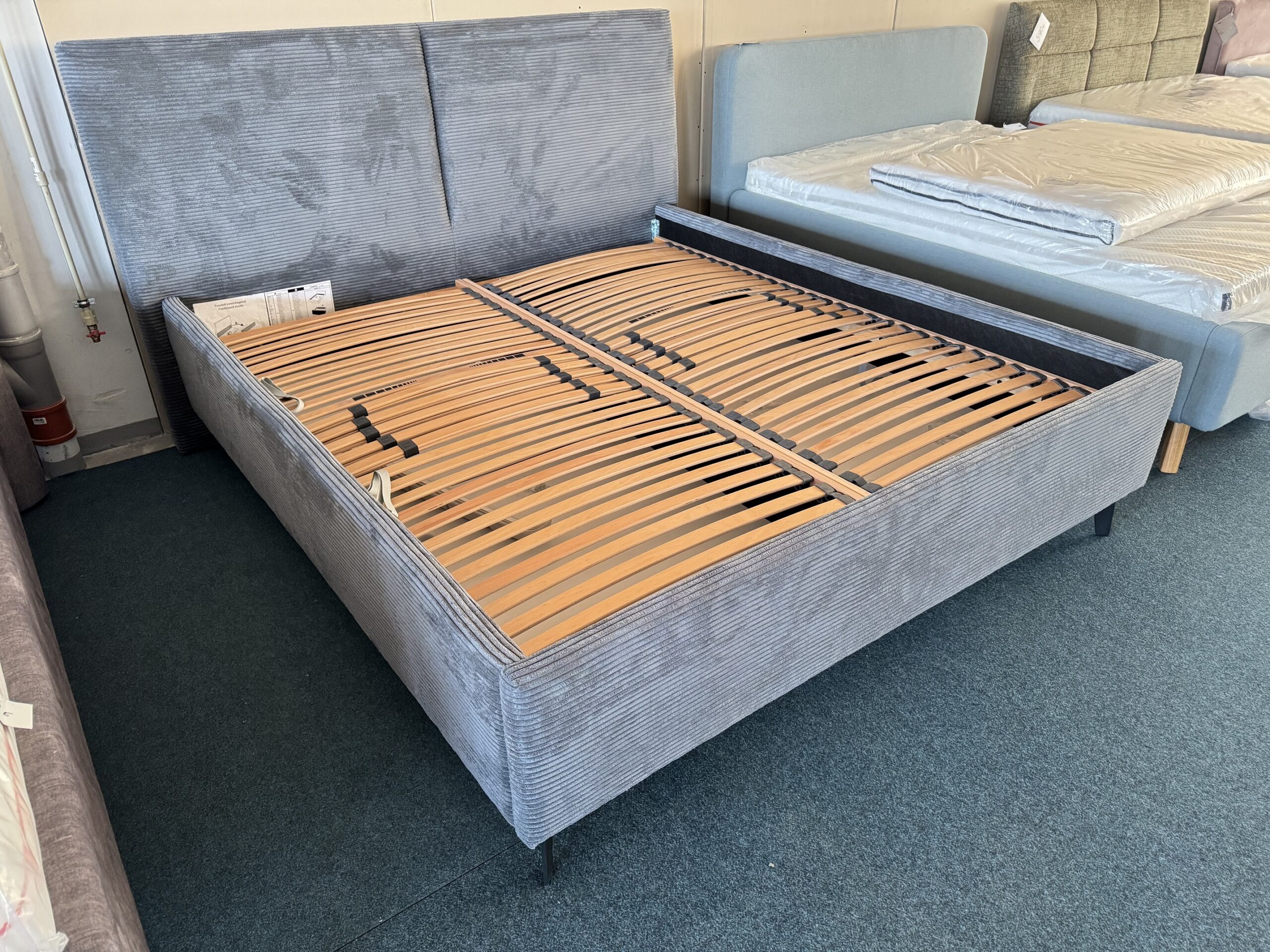 Gulta-auduma-ar paceļamiem reliņiem un veļas kastēm.