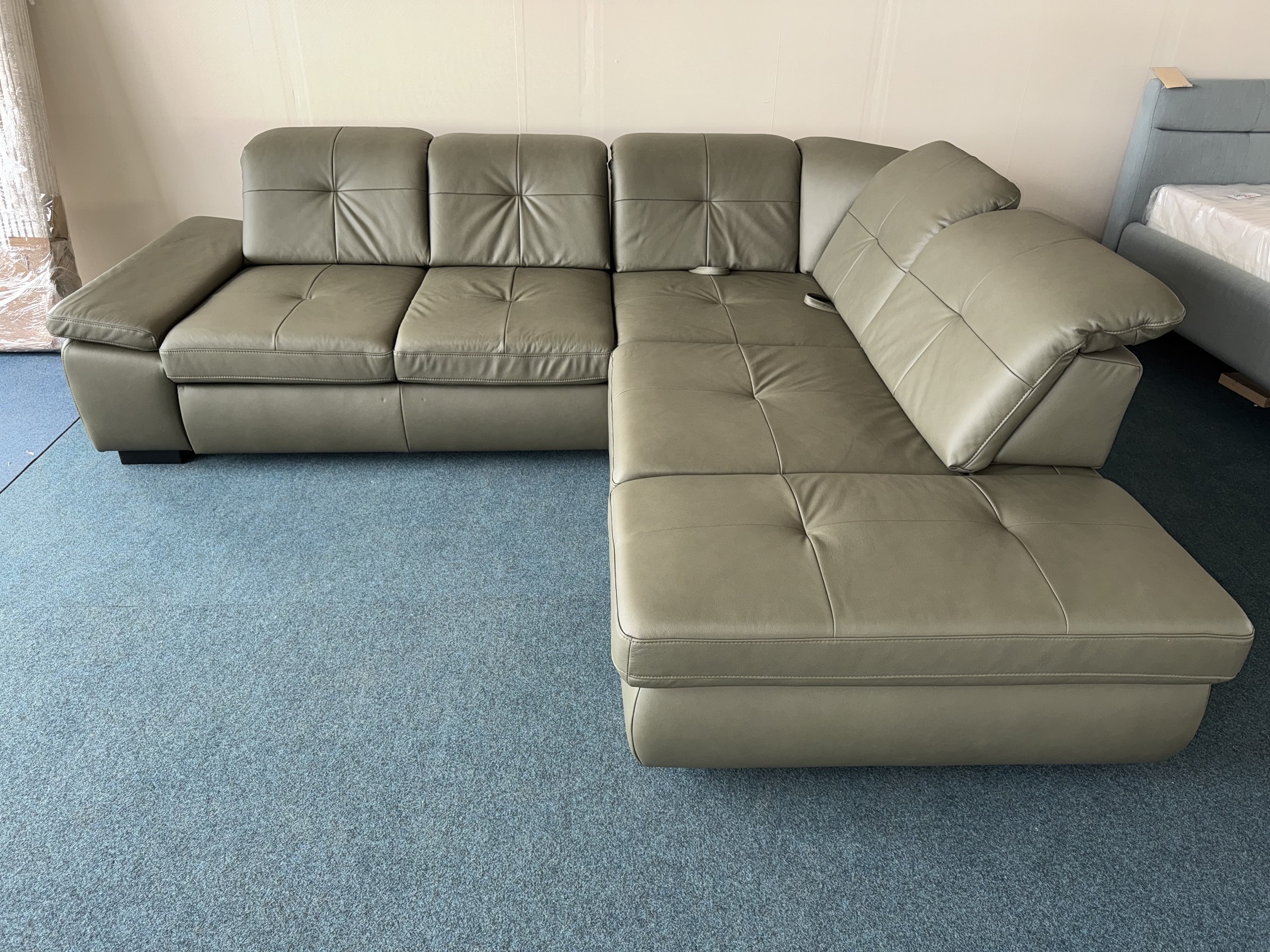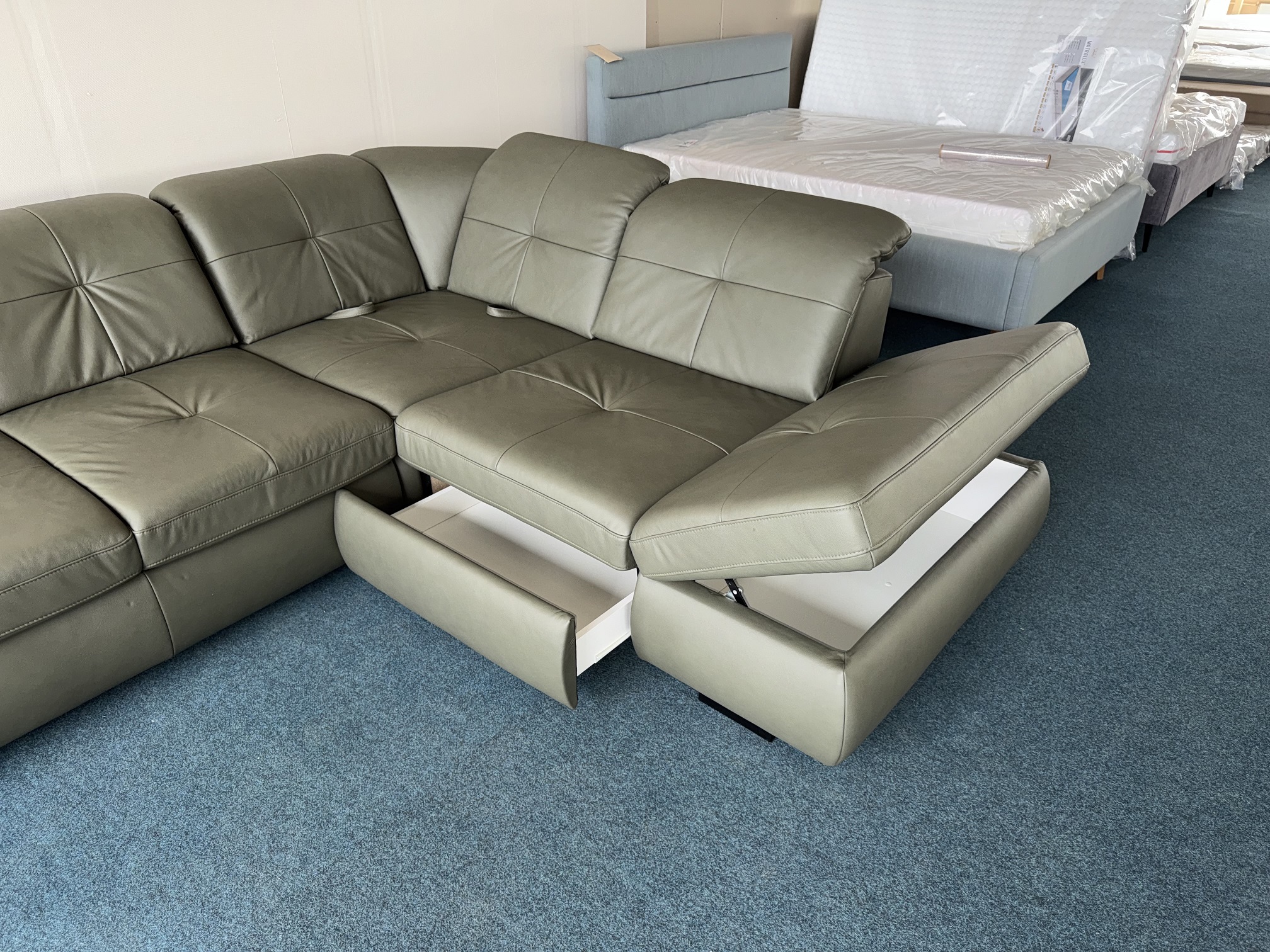 Dabīgās ādas stūra dīvāns-izvelkams+divas veļas kastes. Atzveltnes paceļamas un bīdāmas uz priekšu. Maināms sēžamās daļas dziļums. galvas balsti regulējami. Dīvāna stūrī ir relax funkcija. izvelkamai daļai apakšā ir reliņi. Dižskabārža rāmis. Kvalitatīvi vācu mehānismi. Dīvāna aizmugutr un izvelkamā daļa arī ir no dabīgās ādas. Premium klases dīvāns.