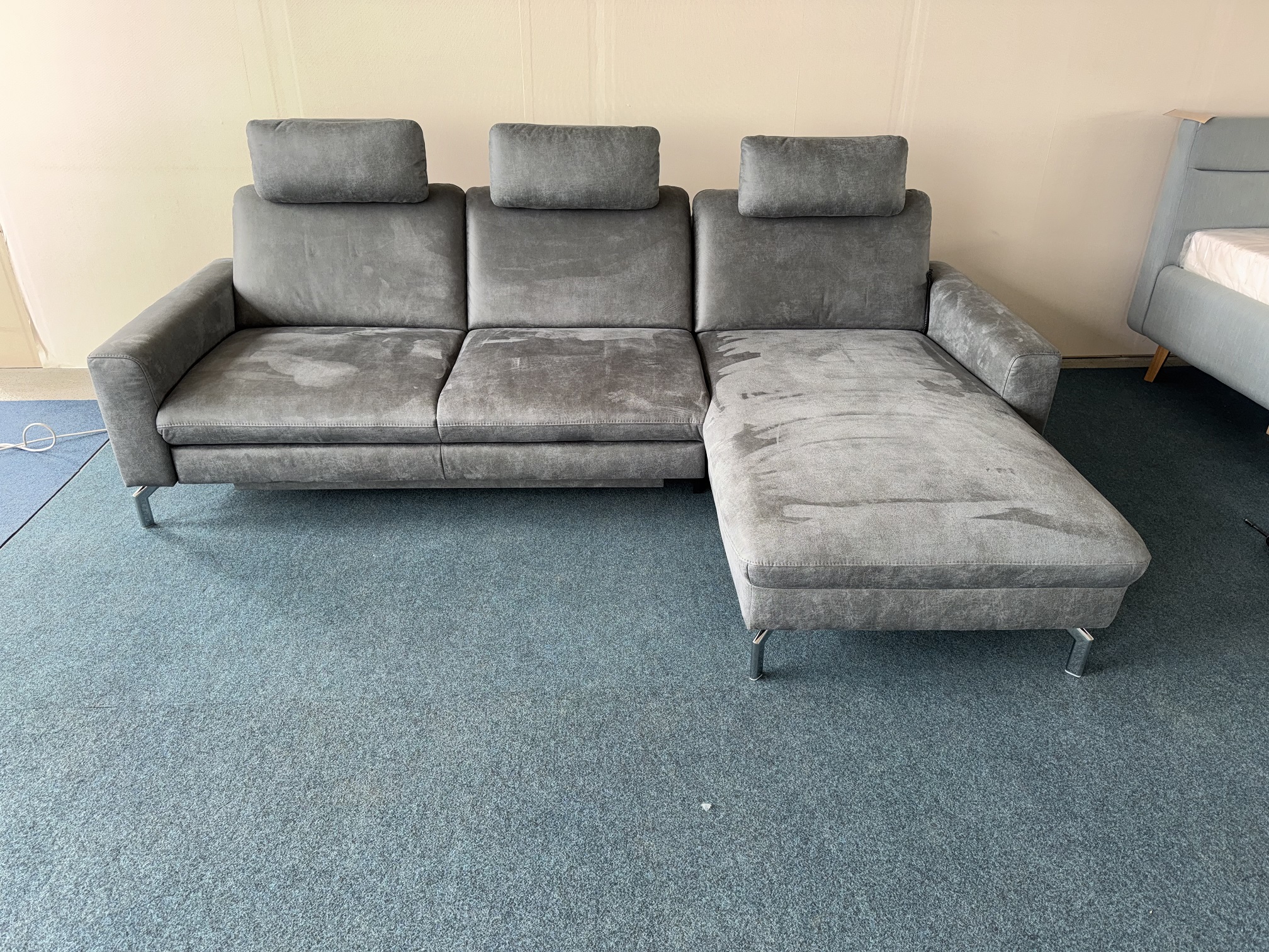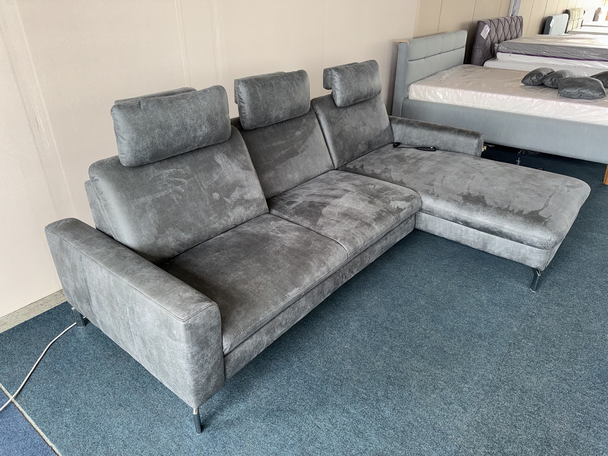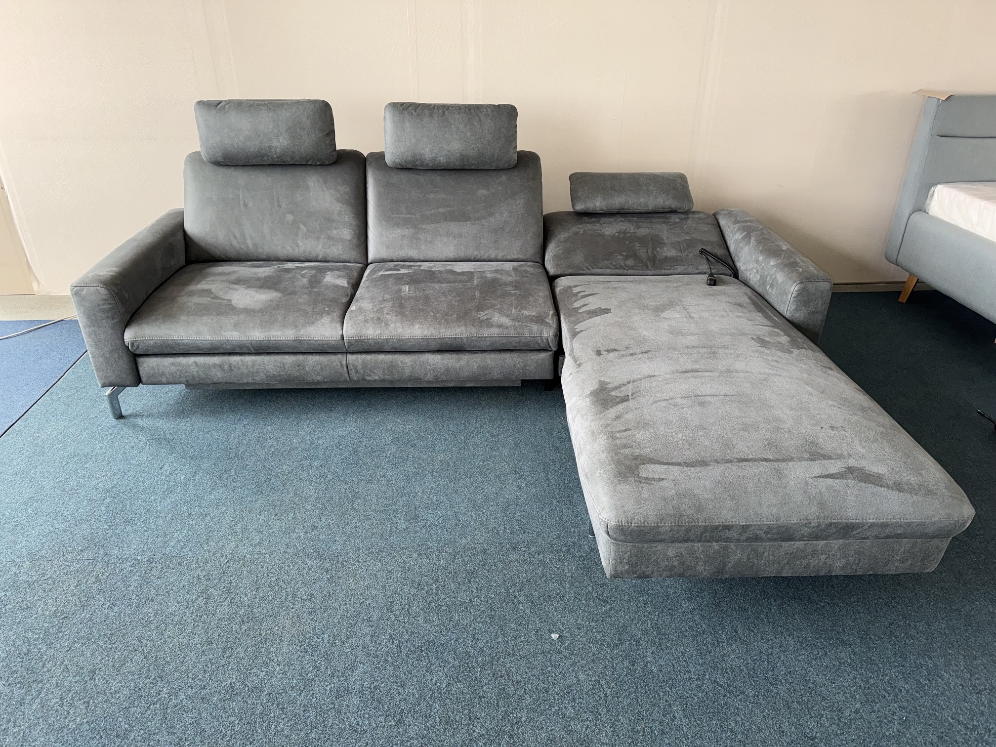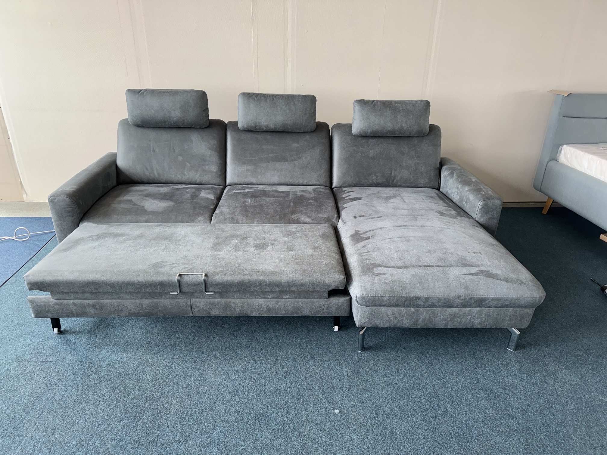 Stūra dīvāns-auduma-izvelkams. Viena dīvāna daļa ar relax funkciju. Izvelkamai daļai apakšā ir reliņi. Dižskabārža rāmis. Kvalitatīvi vācu mehānismi. Viegli kopjams audums. Premium klases dīvāns.