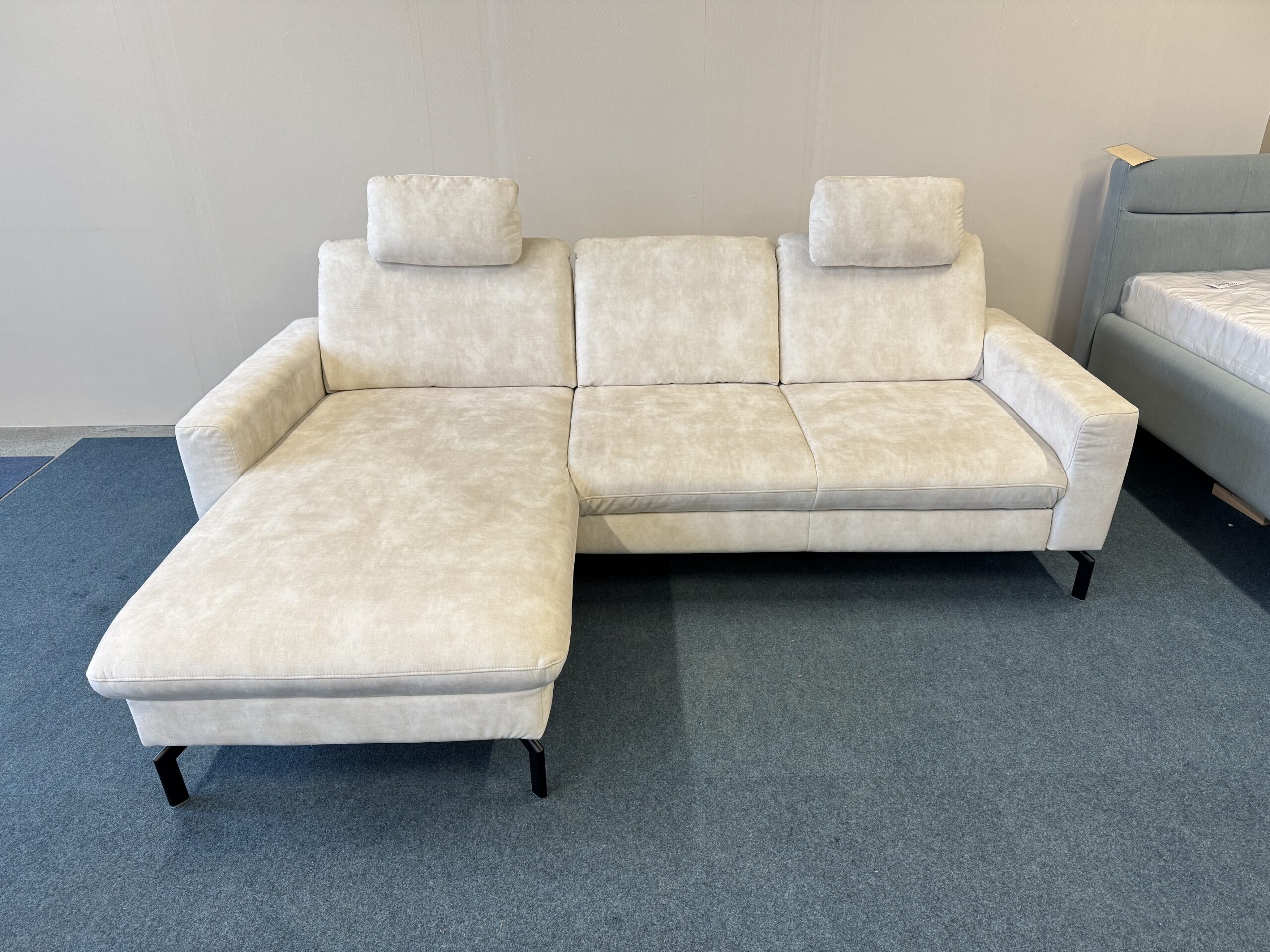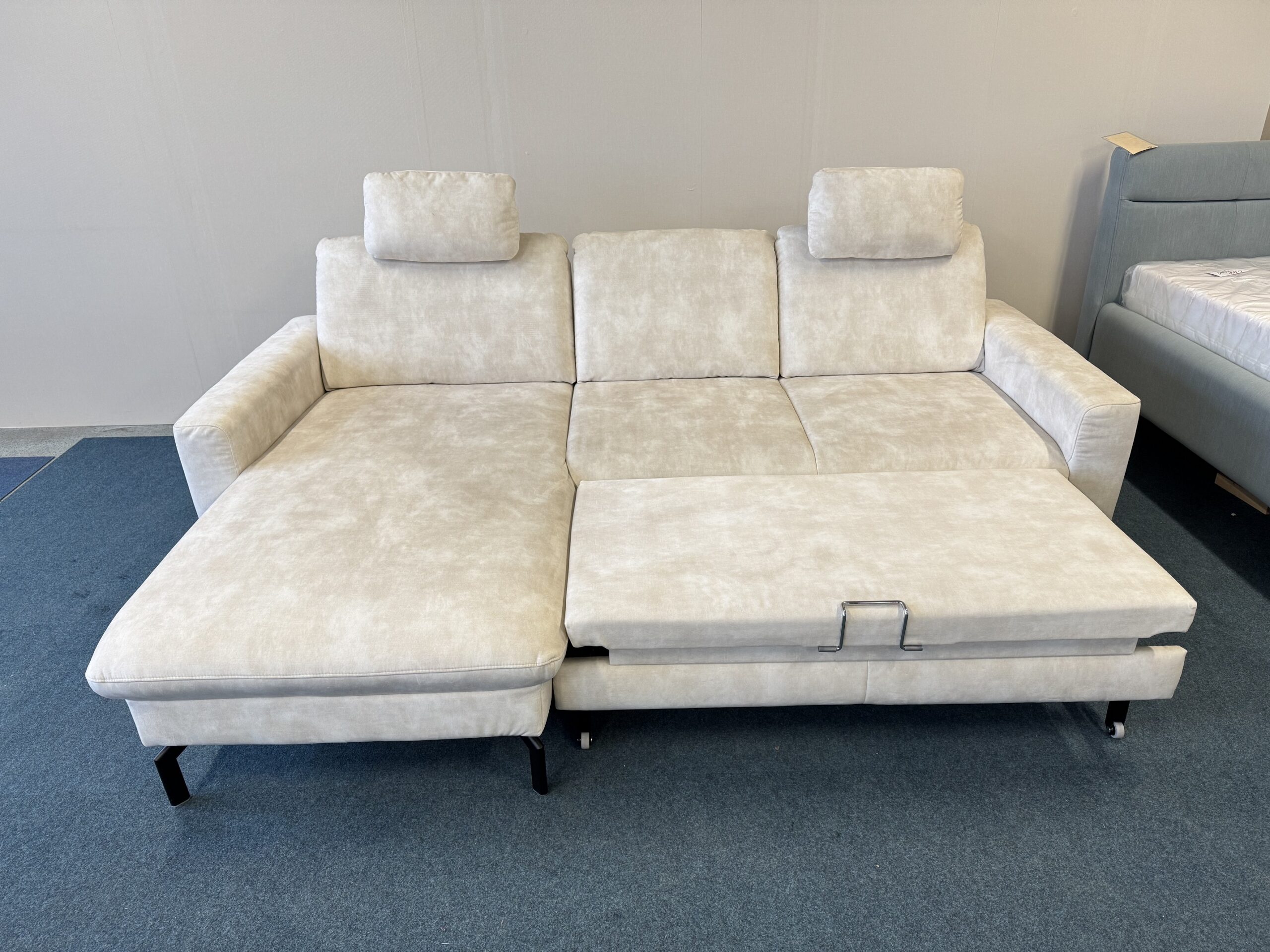 Stūra dīvāns-izvelkams. Galvas balsti ir regulējami, vai noņemami. Dižskabārža rāmis. izvelkamai daļai apakšā ir reliņi. Kvalitatīvi vācu mehānismi. Viegli kopjams audums-Amira ecru. Premium klases dīvāns.