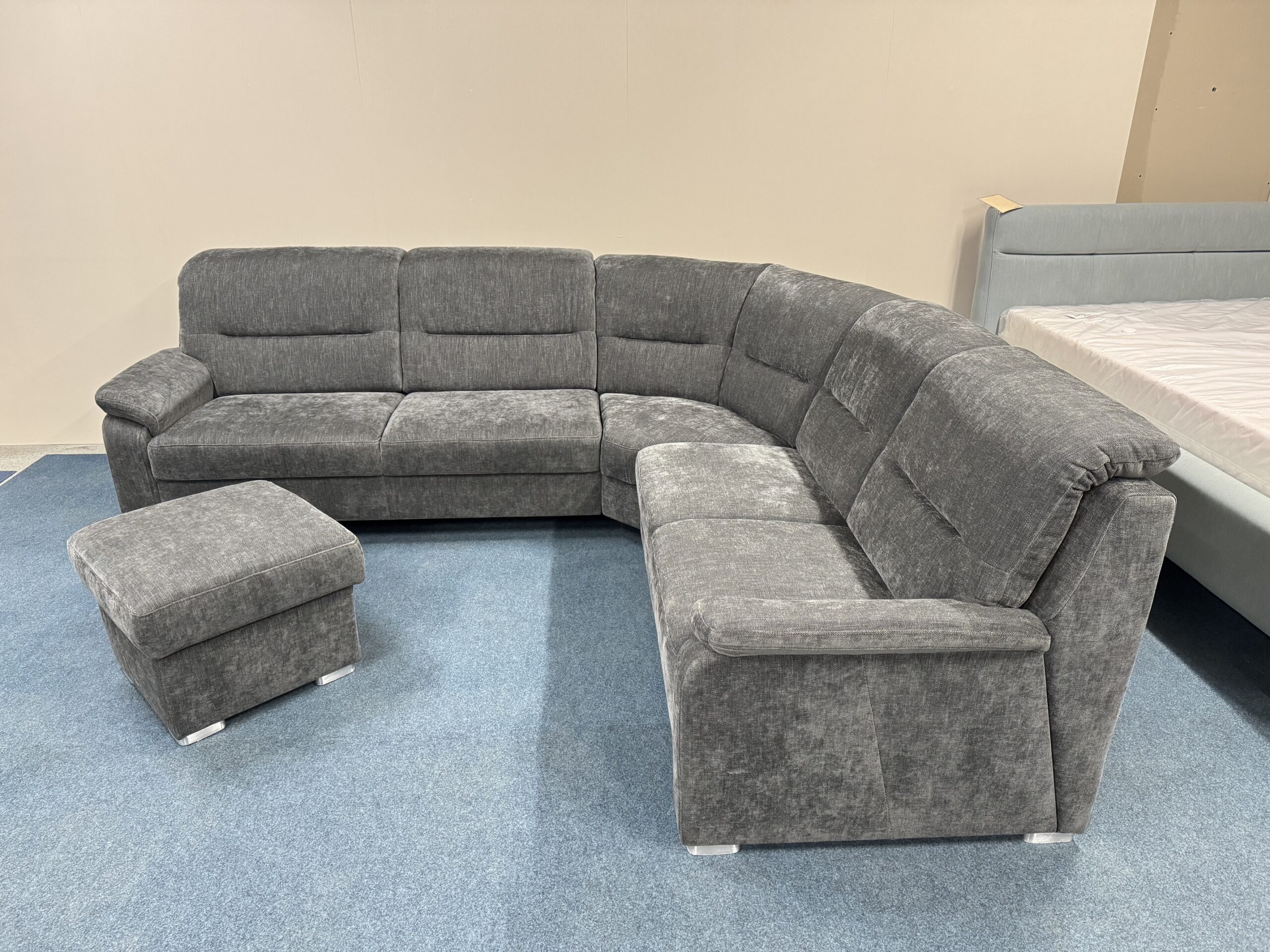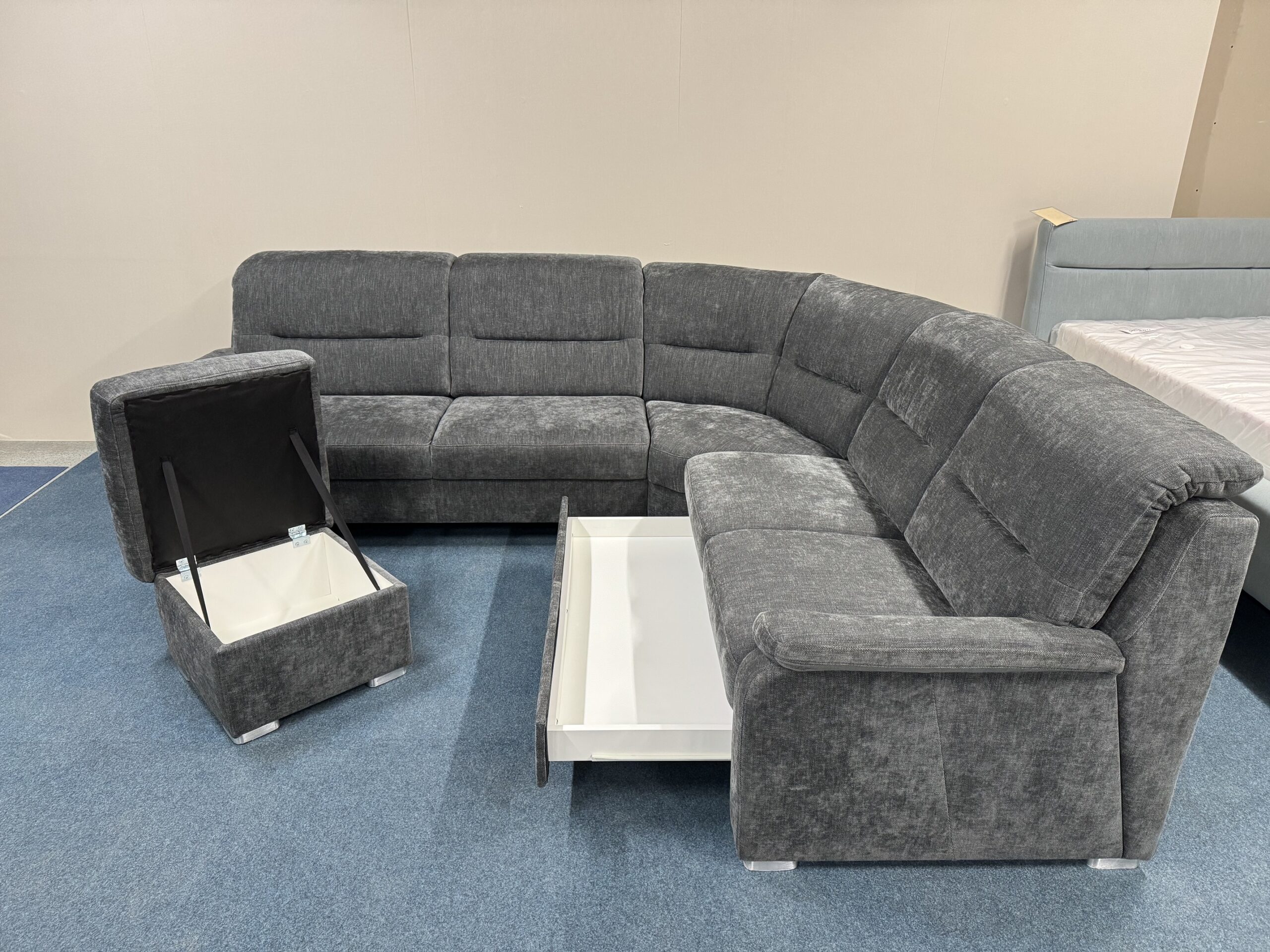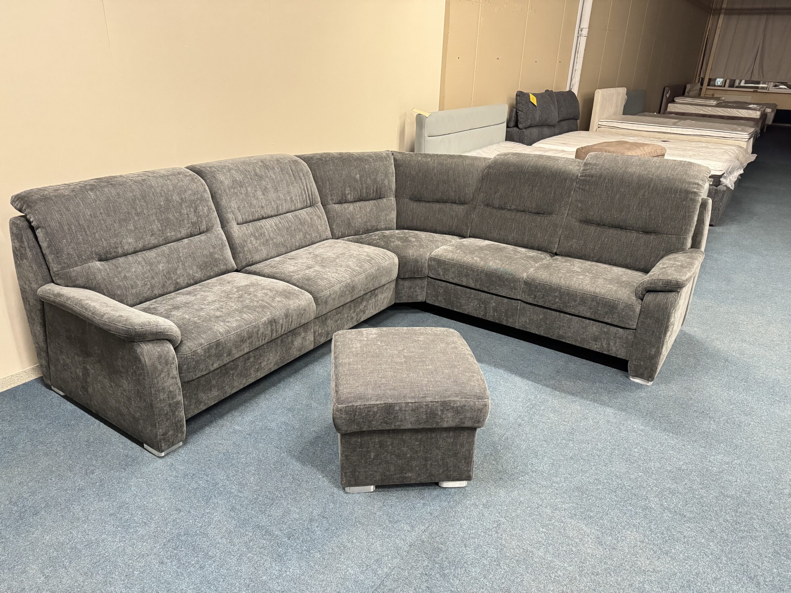 Stūra dīvāns ar veļas kasti +pufs ar kasti. Galvas balsti ir regulējami. Dižskabārža rāmis. Premium klases dīvāns.