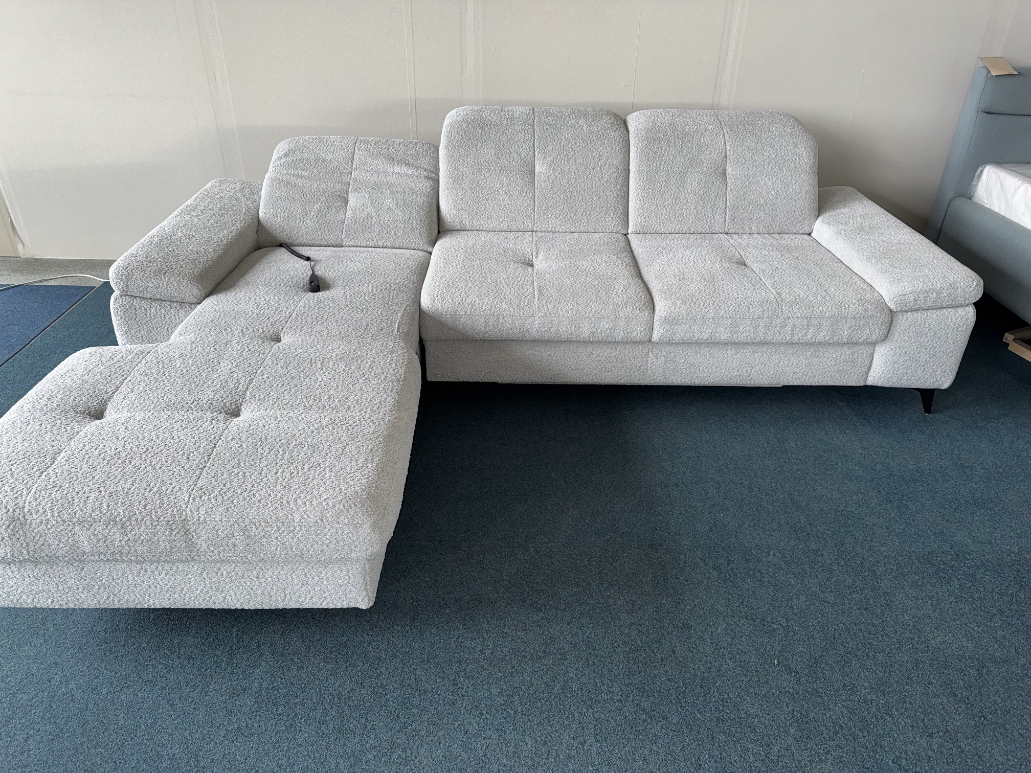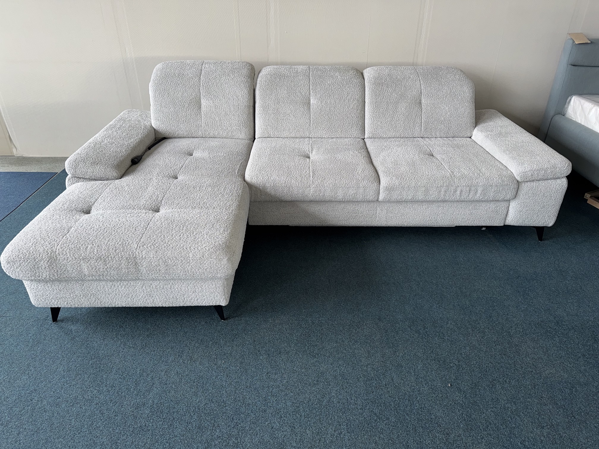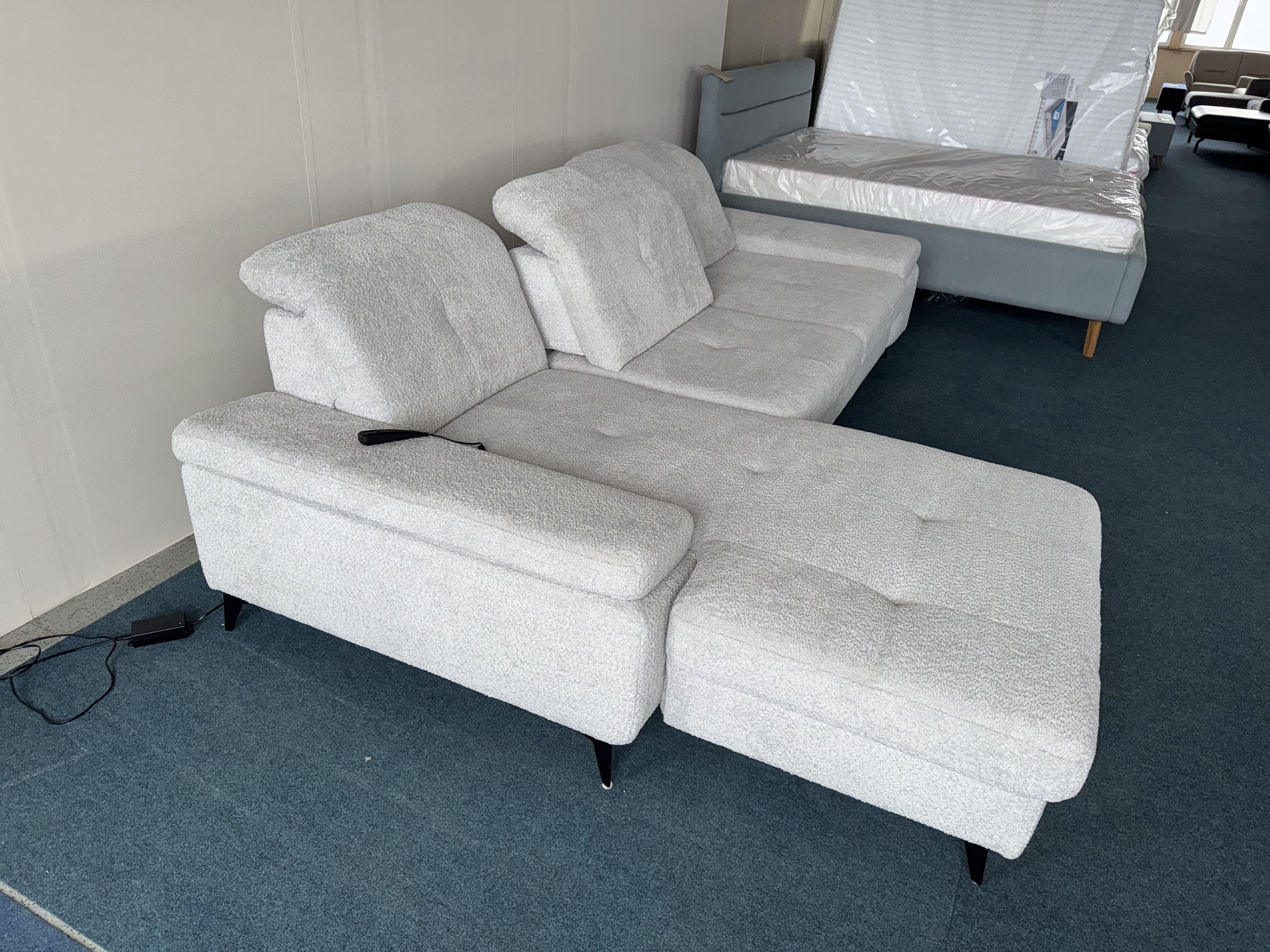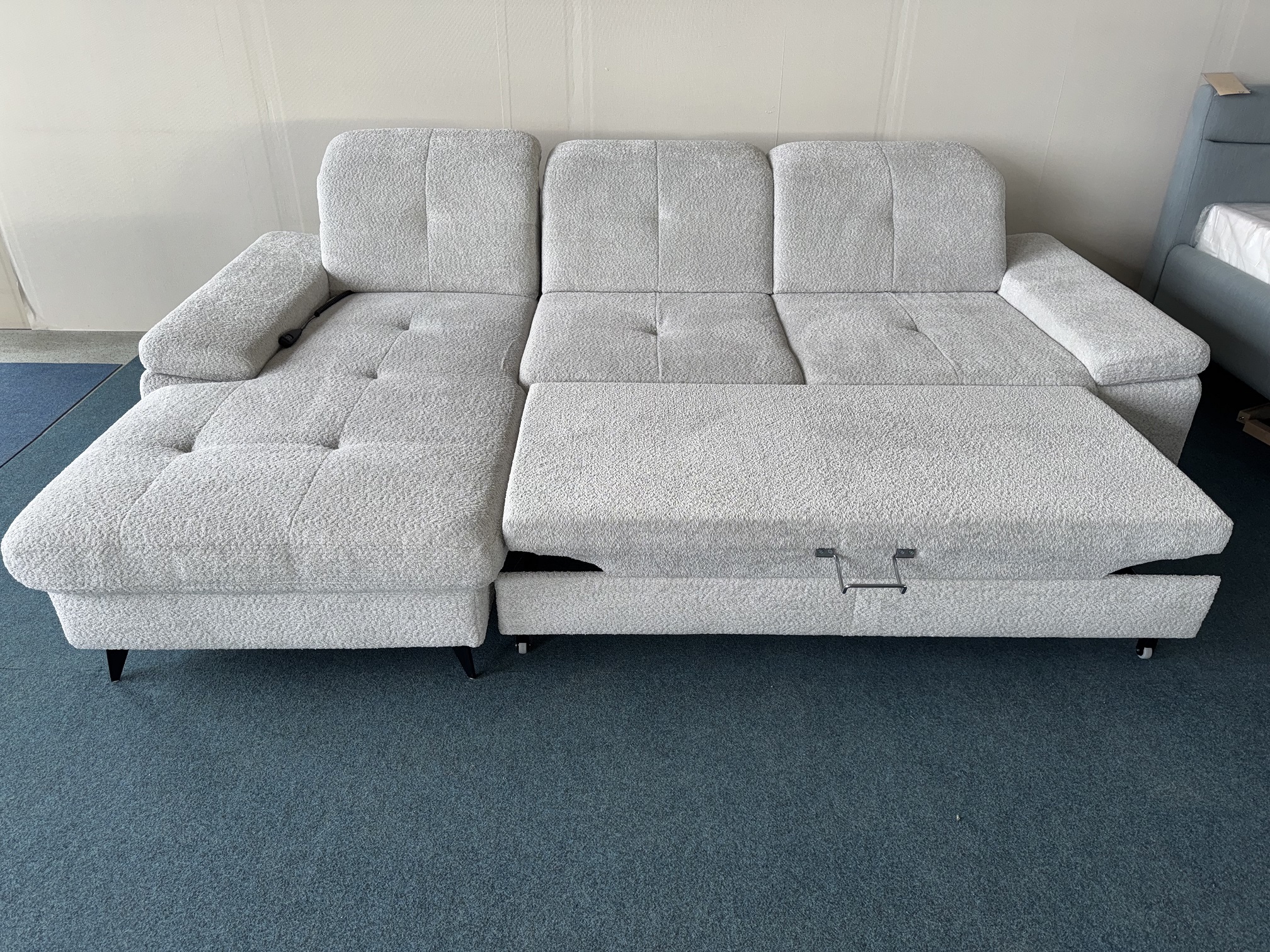 Stūra dīvāns-auduma. Izvelkams. Viena dīvāna daļa ar relax funkciju.Atzveltnes bīdāmas uz priekšu, līdz ar to var regulēt sēdvietas dziļumu. Galvas balsti ir regulējami. Izvelkamai daļai apakšā ir reliņi. Dižskabārža rāmis. Kvalitatīvi vācu mehānismi.