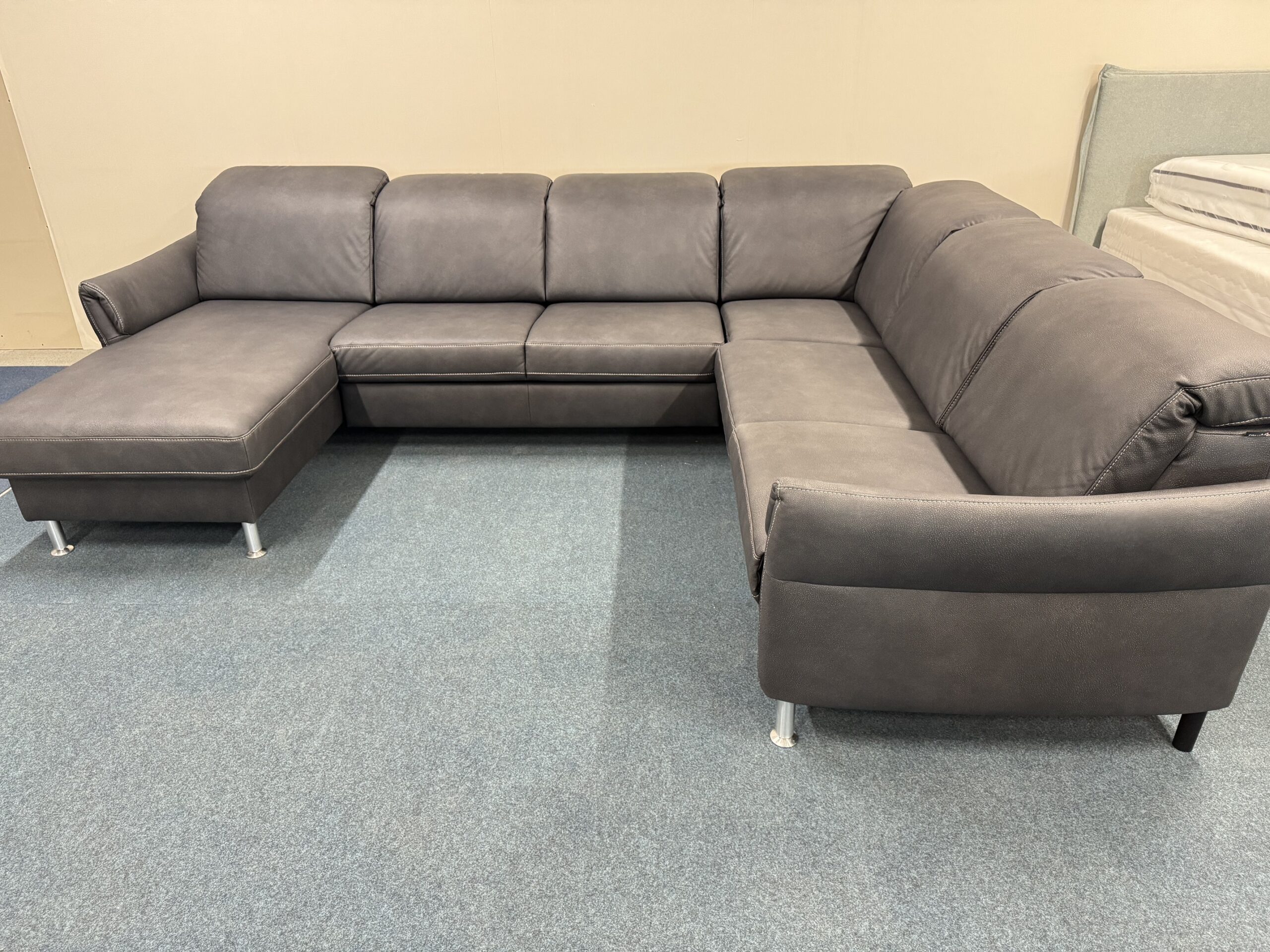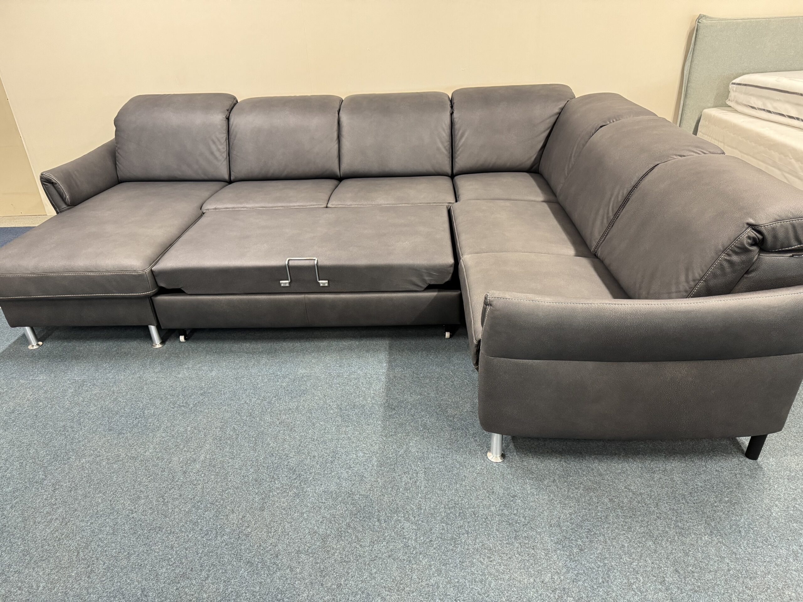 U-formas dīvāns-izvelkams, ar veļas kasti. Vienai sēdvietai relax funkcija. Galvas balsti ir regulējami. Izvelkamai daļai apakšā ir reliņi. Dižskabārža rāmis.